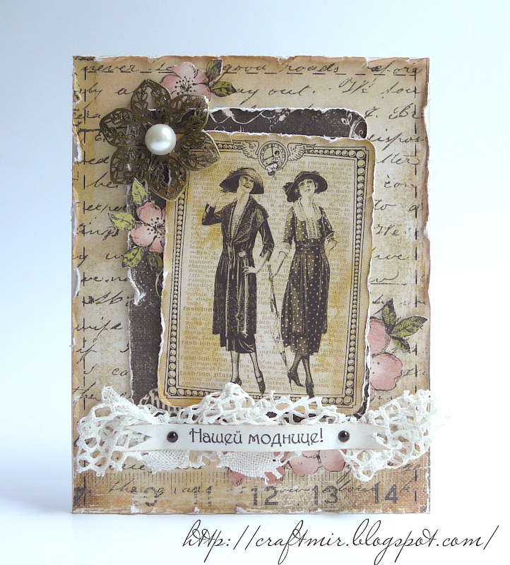 Фоновая бумага здесь Prima "Printery", девушек и цветочки вырезала из Graphic45.. Они на мой взгляд идеально подошли друг другу..Добавила винтажного кружева из бабушкиного сундука, железный цветочек, полубусины..